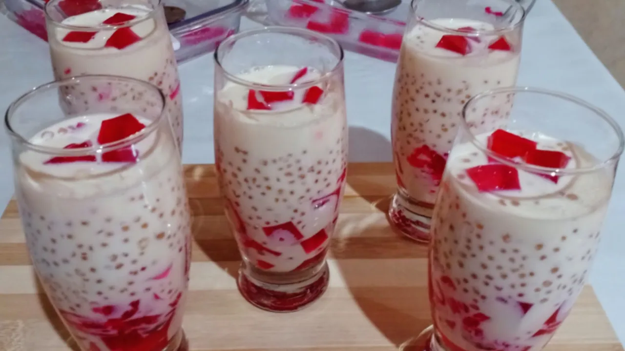 - To assemble, layer the cooked sago pearls, strawberry puree, and coconut milk mixture in serving glasses. Stir gently to combine.